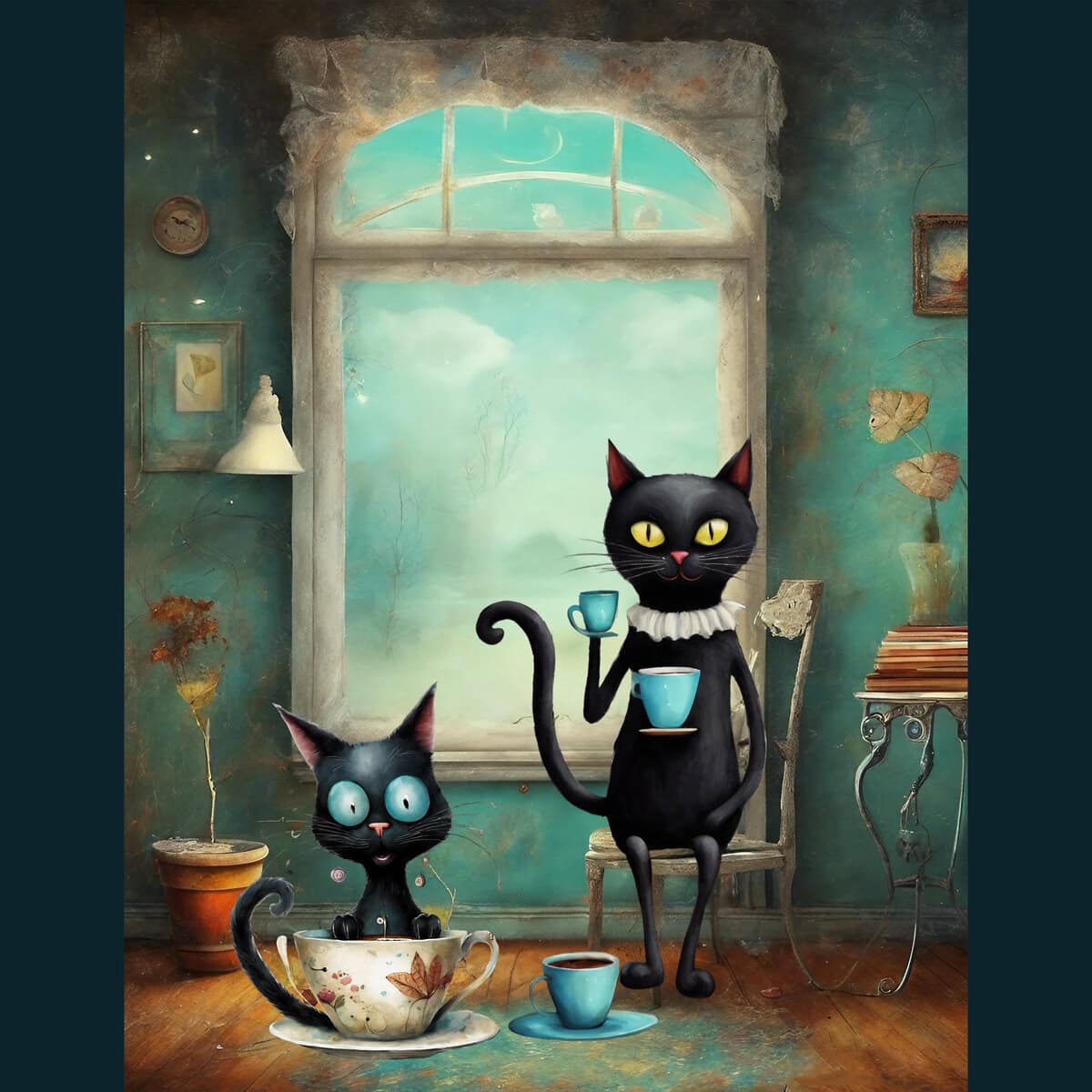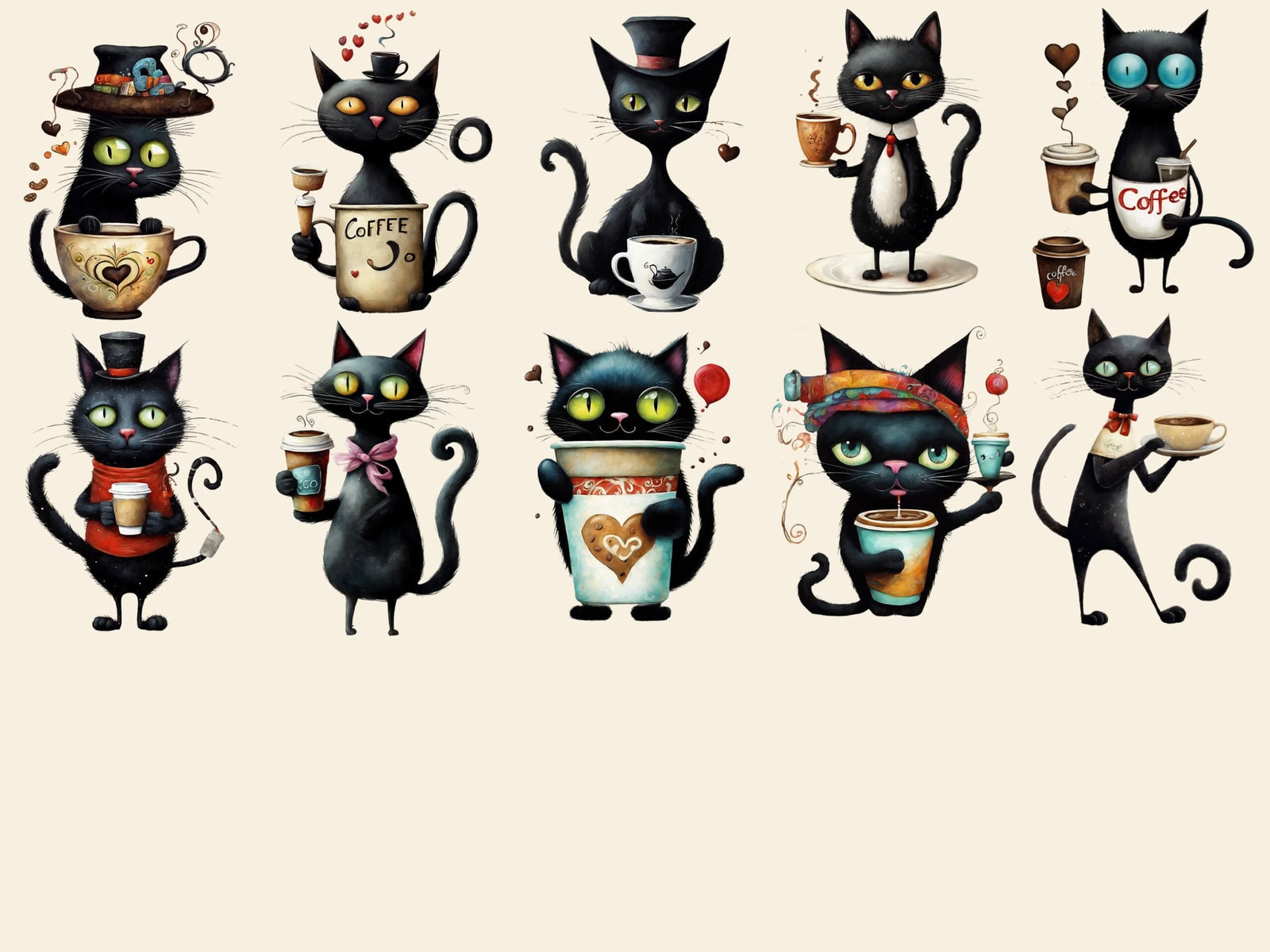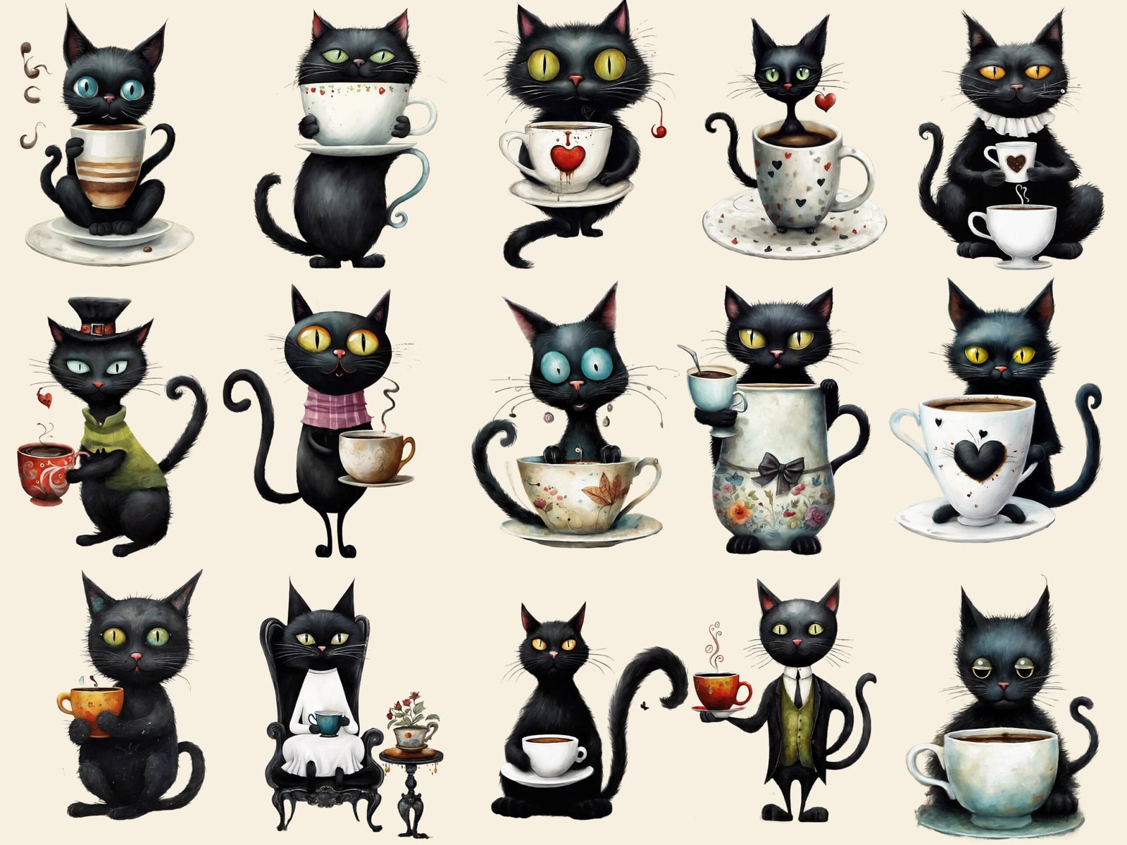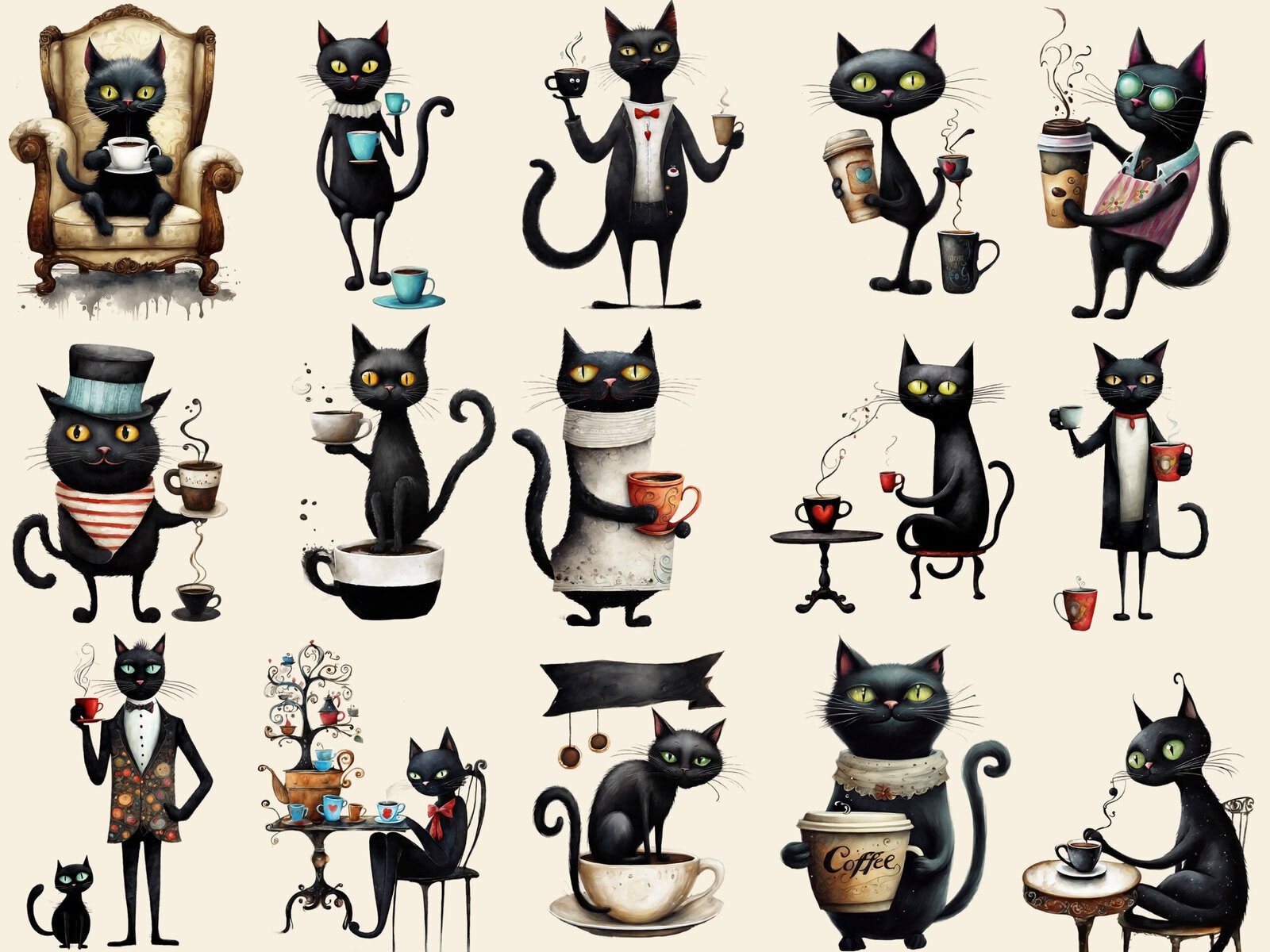 Quirky Whimsy Cat Coffee Lover Clipart & Backgrounds